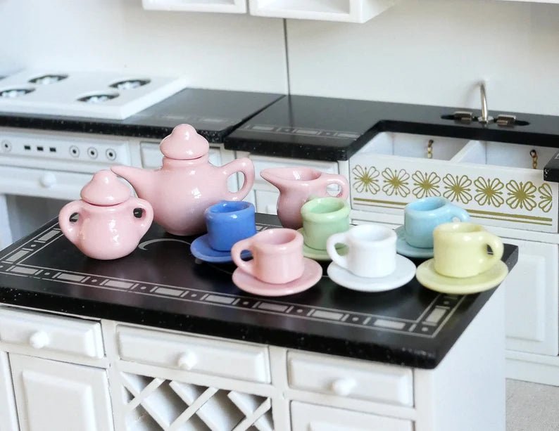 This miniature cup and saucer set is perfect for adding an adorable touch to your doll house kitchen. The vibrant colors are sure to add a pop of personality to any room. Crafted specifically for doll houses, this set is both functional and decorative.