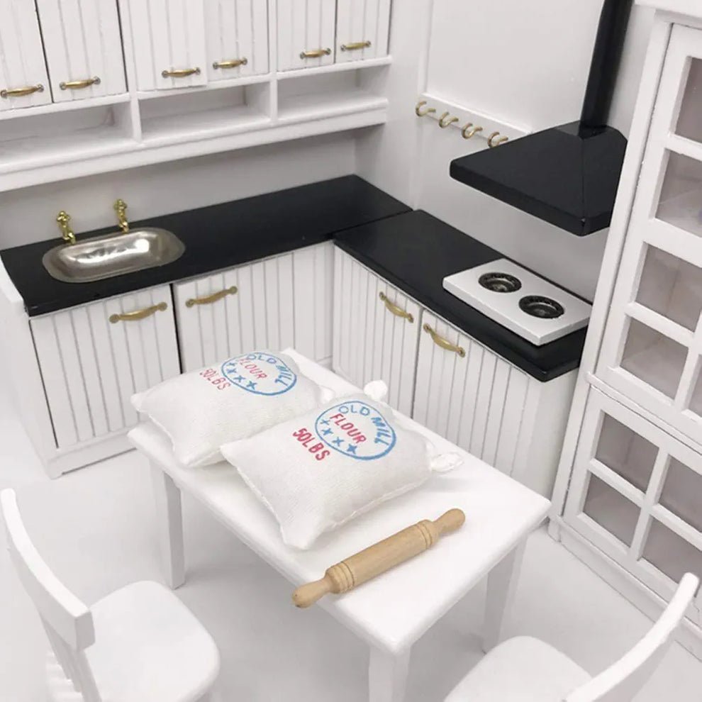 Introducing Flour Bags - the perfect addition to your doll house kitchen! These miniature, realistic flour bags come with an accompanying rolling pin, providing a touch of authenticity to your mini cooking setup.