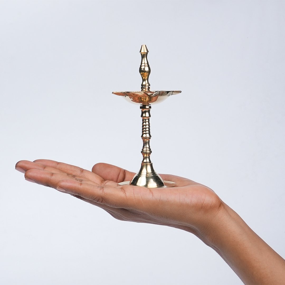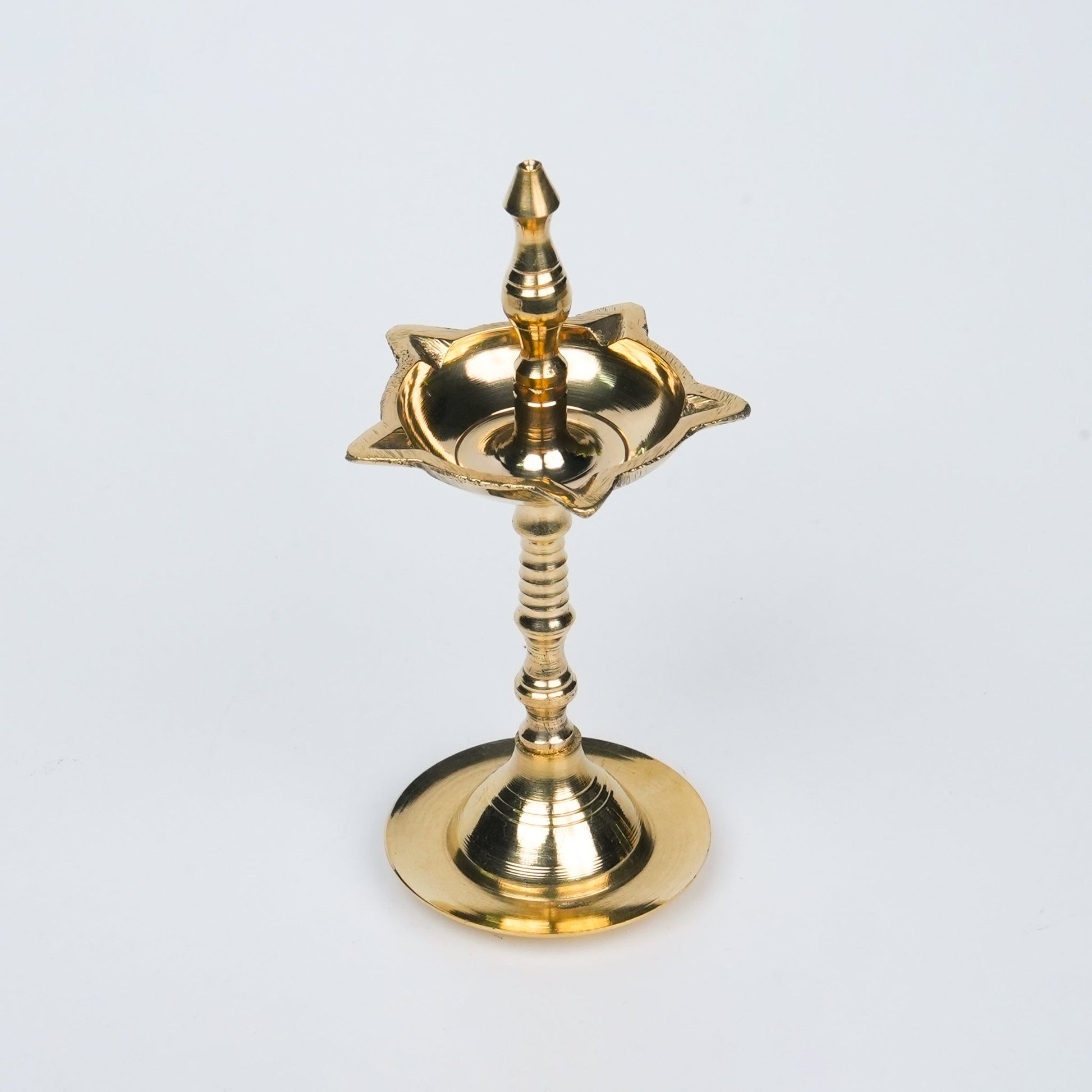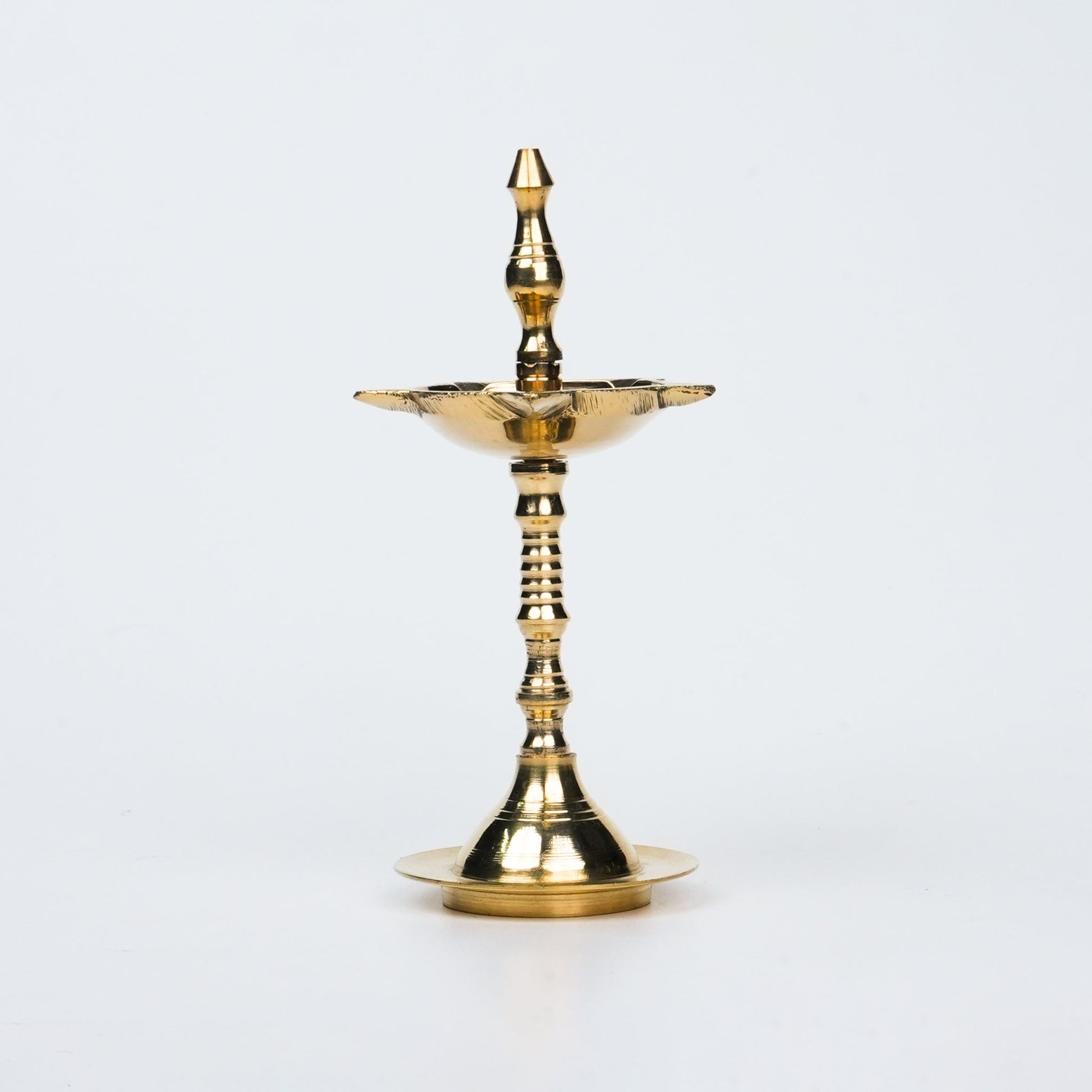 Crafted from high-quality brass, this elegant lamp is perfect for all your pooja needs. Its sturdy construction ensures durability and its beautiful design adds a touch of sophistication to any space. Illuminate your spiritual practice with this beautiful brass lamp.