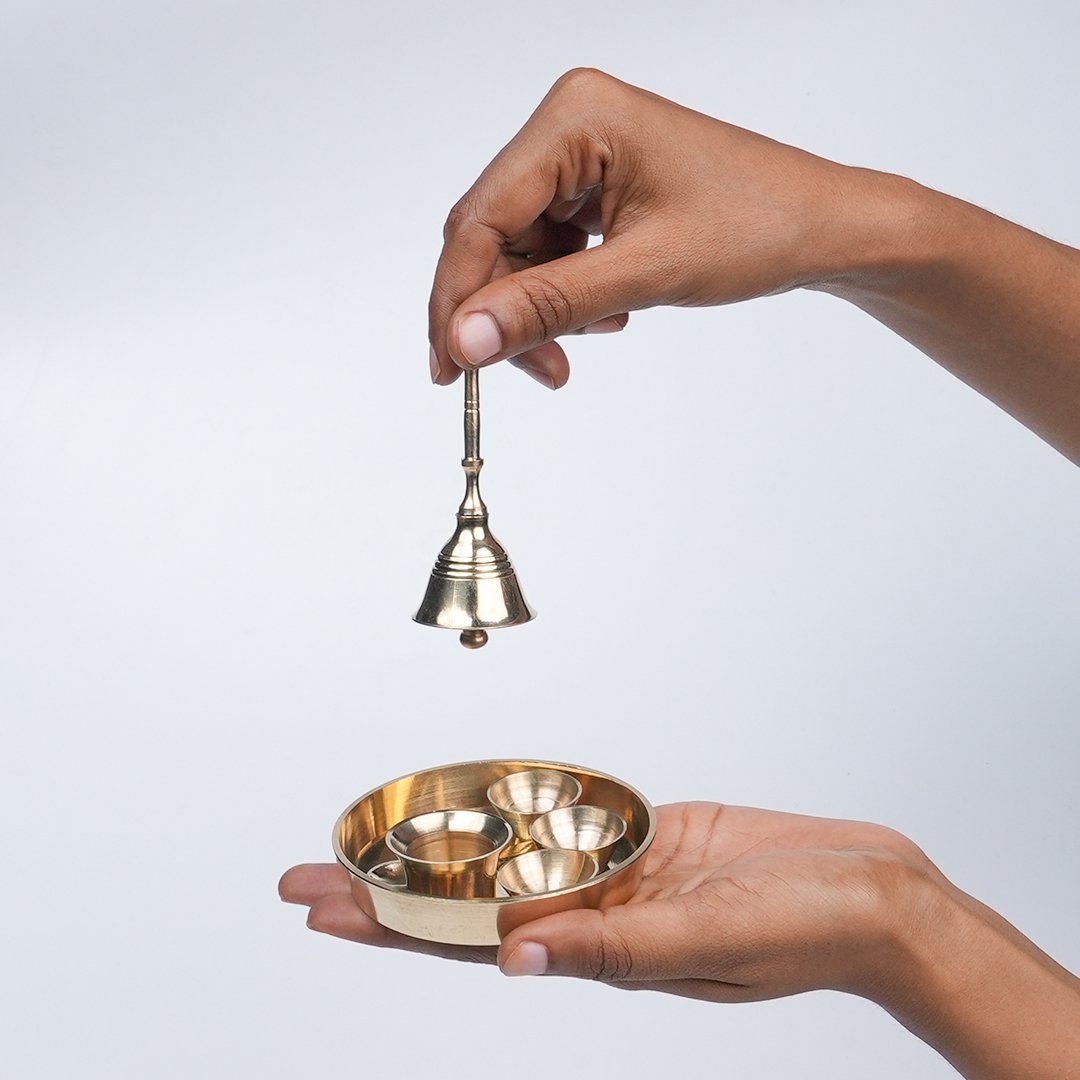 This Pooja thali set is crafted from brass to lend a touch of elegance to your prayer rituals. It contains everything you need for a traditional worship setting, making it an ideal choice for your pooja.