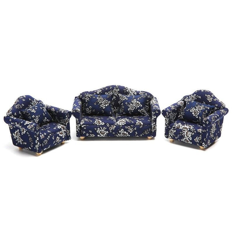 This miniature sofa set, designed for doll houses, includes soft cushions and is colored in a rich dark blue shade. Perfect for young children to play with, this set adds a touch of realism and comfort to any doll house.